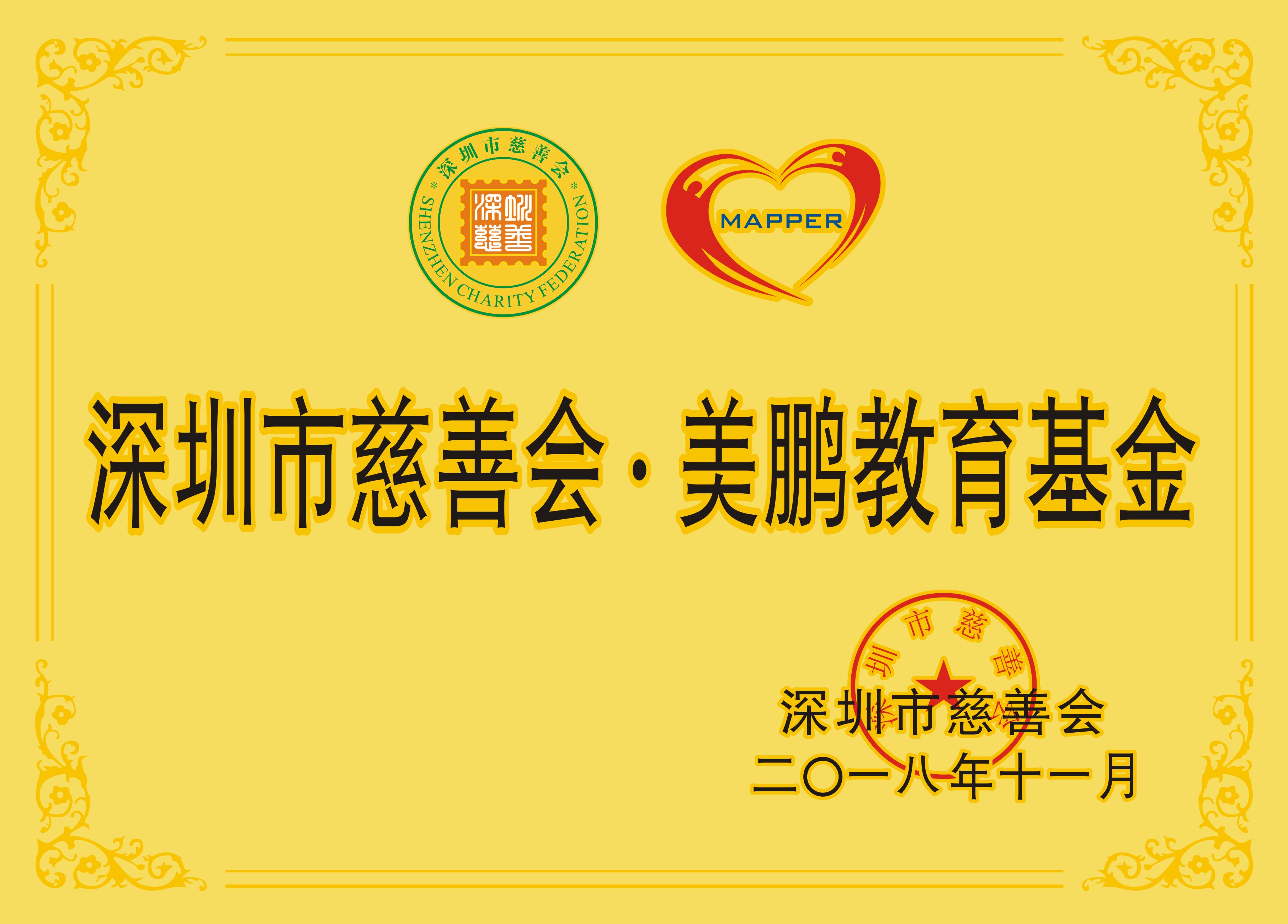 2018年12月6日,美鵬教育基金會(huì)會(huì)長(zhǎng)楊莉受邀參加深圳市慈善會(huì)的基金授牌儀式,現(xiàn)場(chǎng)接受慈善會(huì)頒發(fā)的授權(quán)證書(shū),這意味著深圳市慈善會(huì) · 美鵬教育基金正式成立。